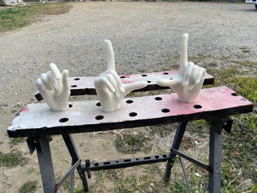 まずは手の模型です。細部まで再現された手の形状や関節の動きを忠実に再現しました。皮膚の質感や爪のディテールまでこだわり、まるで本物の手がそこにあるかのような迫力を感じることができます。こちらは手で簡単につぶせる商品の訴求に用いたようです。