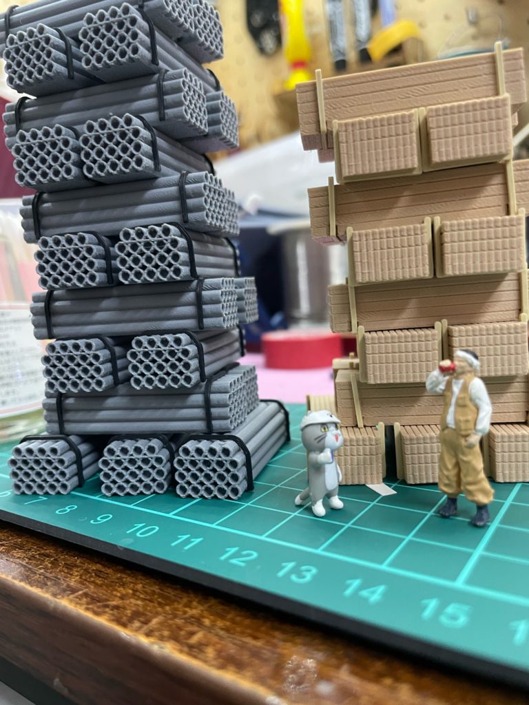 黒木製作所では、TOMIX(トミックス)・KATO製のトラやトキに対応した専用の積荷パーツを製作しています。手軽に載せるだけで、情景の密度とリアリティが一段とアップする、まさに“わき役”ならではのこだわりアイテムです。 ジェンガのように積み上げてみました(笑)
