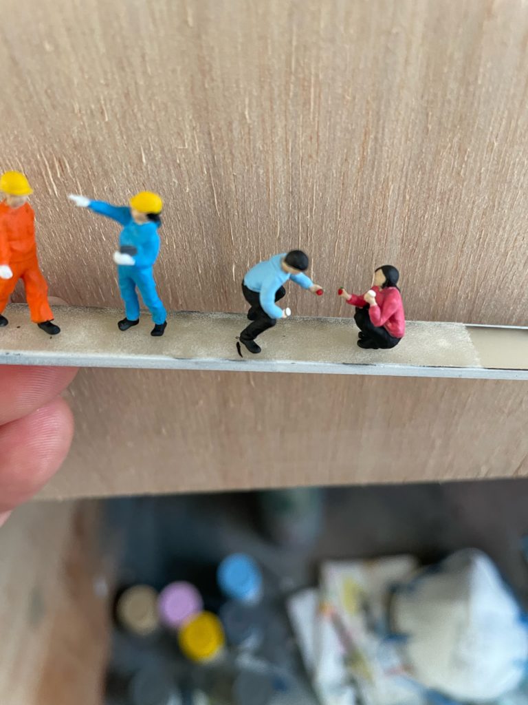 新郎新婦のおふたりが「初めて出かけた旅行先」での写真をもとに、しゃがみながらいちごを手渡し合う様子を1/64スケールで再現しました。
